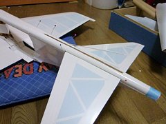 | 基本的に完成 全ての部品が取り付いて完成となった。製作開始からすでに2ヶ月強、多少飽きてきたので丁度良いタイミングでの完成となった。 あとは塗装を行って初飛行に臨むことに・・・どのタイミングで初飛行するかな〜しばらくは放置です。 (メモ) 引込脚のDカット/プラ部品の微調整/尾翼周りの補強 これで完成! 尾翼周りは強度不足は否めない。カーボンロッドを駆使して補強、何とか納得できるレベルになった。 全体を白で塗装して、キャノピーをメタリックブルーで着色するとそれらしくなってきました。 これで完成とします。いつ初飛行するかな〜、飛行場の草刈り後かあ・・・。(2012年5月13日) ![]() ![]() ![]() |
