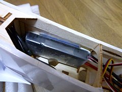 | エルロン サーボは見栄え向上のため横置きなので事前の加工が必要。実際にサーボを搭載して上手く納まることを確認。 ![]() ![]() ![]() |