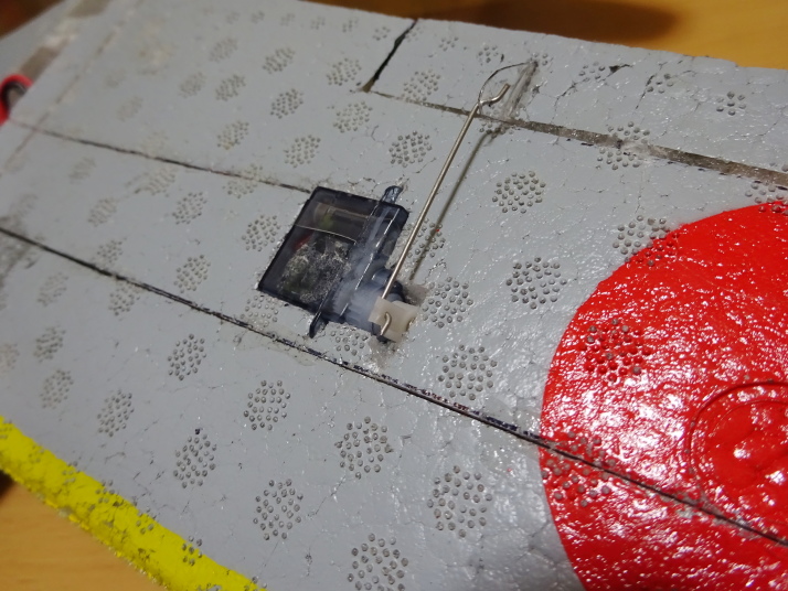 サーボは主翼及び胴体に埋め込んでスーパーXで接着。外れることはないはず。リンケージは0.8mmピアノ線を使用して直結。ホーンは透明アクリル板を流用。スーパーXで接着。