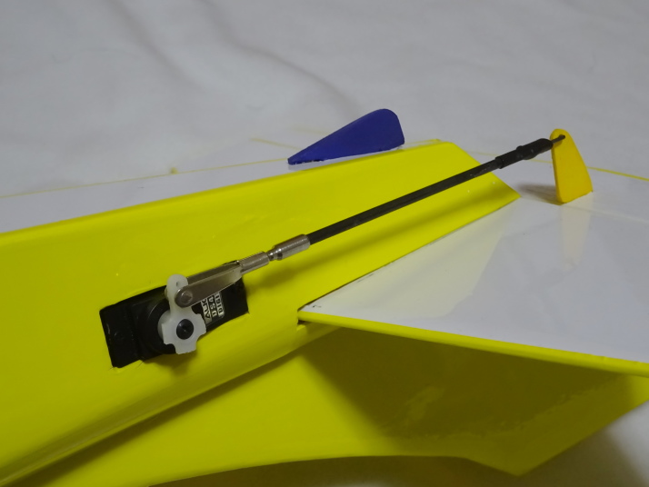 | フイルム貼り完了 表が黄色で裏が白のワンパターンのデザイン、部屋の中が黄色の飛行機だらけとなった。 メカ搭載 モータを組み込んで実際に回してみた。ペラはAPCの6×5.5、ホビキンの40mmのアルミスピンナーを使用。1万回転を超えると振動発生、取り付け方を微調整するも改善しない。安物はダメということ。仕方ないのでモータ付属のコレットを装着。こちらはフルハイでも振動なし。15000回転は超えることを確認。手元にダイヤ、ピッチの異なるペラがあるので良いものを選ぶ必要がある。 エルロンは取り付けスペースの関係で6gサーボ2個とした。デファレンシャルの設定もできるので良いと思う。空戦フラップは効果あるのかな? エレベータは9gサーボを使用。リンケージはカーボンロッドを使って剛性を確保。ホーンは長めにしてサーボのトルクを有効に利用できるようにした。 重心の関係でリポ電池は重心位置の近くに配置する必要がある。メカ室は広いが電池と他のメカとの干渉が無いようにレイアウトを工夫した。 |