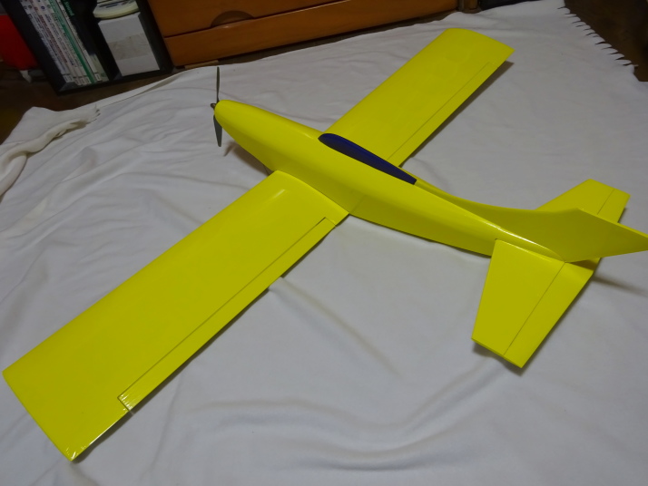 | 生地完成 尾翼を製作して生地完成。フイルム貼り前の状態で全備重量520gと軽量。重心は相変わらず前重心だが、リポ電池を重心位置に持ってくればOK。 10パイロン機の規定に800g以上というのも含まれいるので本来なら300g近くを追加する必要がある。レースする訳でもなく、当初の計画通り600gとして重心合わせのために後部にウエイト積むのが現実的。(2020年1月30日) フイルム貼り いつもの場所でサンディング。形状が単純なので1時間余りで終了。気になる箇所をパテ埋めして最後は400番のペーパーで仕上げ。 フイルムはマッドマウス用に購入した黄色とと白色の2色。自分の機体は黄色系が多いが、何より視認性が良いのが理由。尾翼とエルロン終了。(2020年2月2日) |