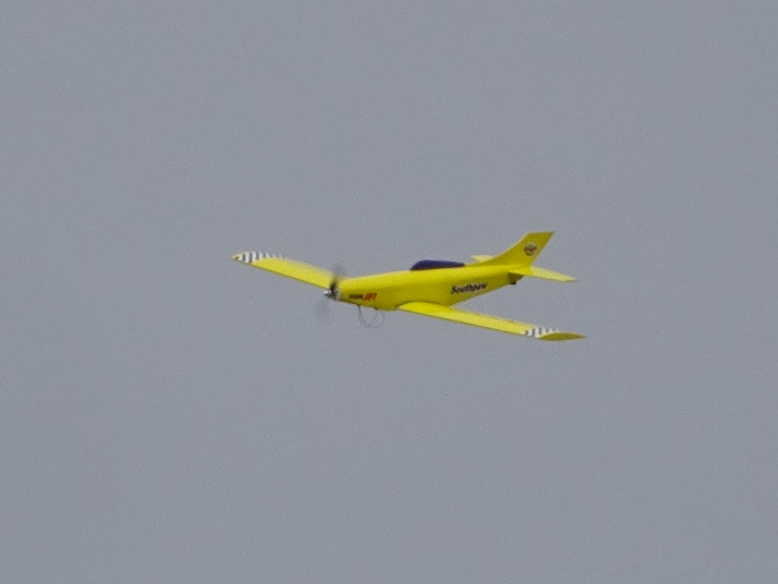 | 初飛行 穏やかな天候の中での初飛行になった。舵角の方向を確認、M口さんに手投げをお願いした。手を離れた機体は直ぐに上空へ。ダウントリム3コマ入れて落ち着いた。エルロン方向はノートリム。 飛行特性は変な癖がなく真っすぐに飛んでくれる。旋回時に巻き込むことはなく、速度を落として旋回しても失速に入る気配はない。翼面荷重32gの効果。 高速時には舵が敏感になるのでD/Rを切り換え。しかし、速度が遅くなると途端にエルロン方向の舵が効きにくくなる。D/Rの切り換えは適宜行うことが必要。 肝心の速度は、比較対象がなく機速を直接測定することもできないので何とも言えないが、普通の機体よりはかなり早い。フルスロットルでのパイロンターンは気持ちよい。旋回時に高度が落ちないので安心してターンできる。 そして着陸へ。低速時でも舵が利くので着陸コースに入れるのは容易。丁寧に高度処理して芝生の上に着陸。無傷で帰還でした。 今回は少し緊張したが、素直な機体で操縦が簡単。ピッチング方向の安定性が高いで滑らかに飛んでくれた。大成功! 2回目は自分で手投げ、途中で操縦を変わってもらって写真撮影。小さな機体なのでピントが合い難いが飛んだ証拠にはなる。黄色は映えます。 着陸は少し速度がある状態で行った。接地寸前で伸びるのはパイロン機、ピアノ線の主脚も上手く機能して無事に着陸。 リポ電池は写真撮影で5分以上飛ばして残量40%。容量不足の心配なし。 何はともあれ良く飛ぶ機体。 |