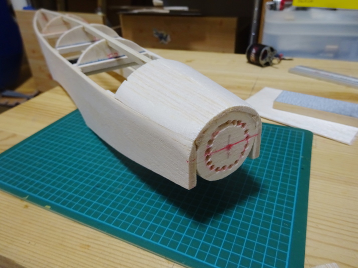 | リポ電池は燃料タンクの部位に差し込むようにした。経験的にこの位置にリポ電池を置くと重心が合う。今回はどうだろうか・・・。 これで事前に必要な工作は終わり。胴体上面をプランク。製作記事ではプランク材は2mmとなっているが、今回は3mmのソフトバルサを使用。一気にプランクするのではなく、分割して胴枠の間をプランしていく。この方法は空野氏のミグ15などで経験あり。3mmバルサを使うと後行程のサンディングが楽になる。 機首に見えるはモータマウントを接着するための部材、後でモータの大きさ分だけくり抜く。これにより機首周りの工作が楽になる。(2020年1月19日)。 |