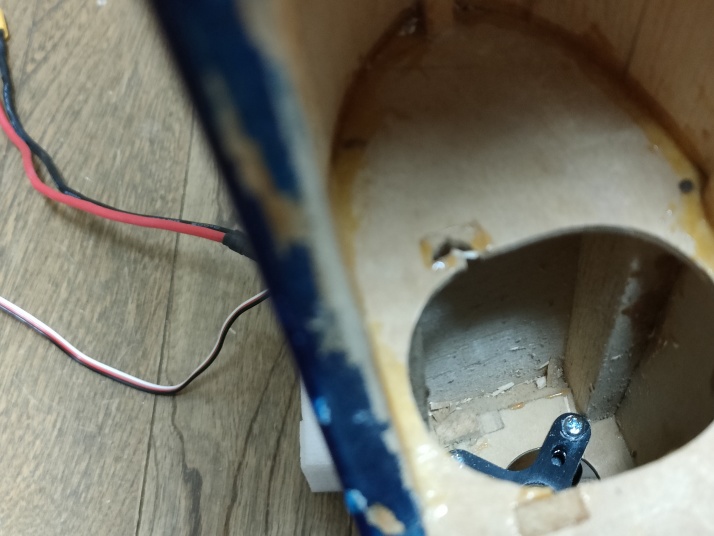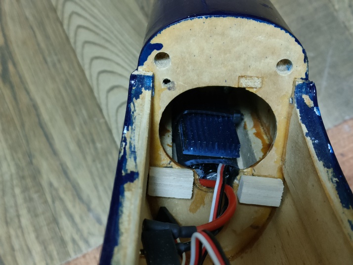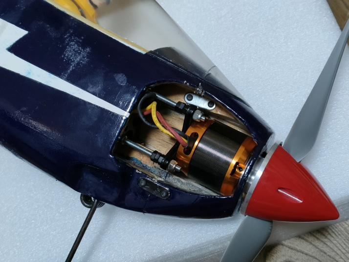 | モータ搭載 20クラスのモータとして、FSD FC3536-6T 1270KVを選択(KKホビー)。バッテリは3セル2600mAh、データシートから、APC 9×6E、 1万回転、40A、 推力1600g程度と予想。 当時のスタント機は機首が細いので、エンジン仕様で製作された本機にモータを載せることは簡単ではない。結局、不本意ではあるが機首を切断した。濃紺なので意外にカットラインが目立たないのが幸い。 モータは長さ50mmのM3ねじと、十字のモータマウントを組み合わせたもので固定。M3ねじはタンク側から挿入することになるが、狭い空間での作業なので少し大変。着磁したドライバーを使用して何とか完了。 切断した機首は、モータと干渉しないように内部をえぐる必要があった。リュータが大活躍。 この機体、サイドスラスト及びダウンスラストは共にゼロ度になっている。 |