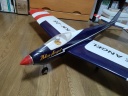 | 無事進空 本機はエンジン仕様で未飛行なので、今回が本当の初飛行。 図面上では舵角の指定がないので、類似のスタント機のデータを参照。エルロン±5mm、エレベータ±10mm、ラダー左右25mmとした。 飛行場で初めてフルスロットル、振動もなく問題なし。スロットルオンでスルスルと滑走してあっさり離陸。上空でトリム合わせ、エレベータを3コマアップ側でOK。 座りの良い機体で真っすぐ飛ぶというのが第一印象。簡単なスタントは問題なくこなす。特にロール軸は綺麗に通り背面時のダウン操作は不要。 フルスロットルで垂直上昇、推力比は1.1程度なのでそこそこ。昔飛ばしたことのある先輩によるとチュンパイなしのエンジン機並みとのこと。 自分としてはもう少しパワーが欲しいが、搭載できるリポ電池、モータ、ペラの制約から現状で良しとすることにした。 着陸は意外に早く、遠くから降ろしてくる必要あり。本日は2フライト、いずれも綺麗に着陸。 リポ電池の交換は主翼を外す必要がある。本機の主翼固定ボルトはつまみの付いたタイプ。手で外すことができるので主翼交換が簡単に行える。このタイプのボルトは現在では入手できないのが残念。無くさないよいうにしないと。 尾翼の一部に裂けを発見、どこかに当てたようだ。絹張りの宿命、ここはティッシュペーパー+瞬間接着剤の出番。 無事に飛んでホットしました。頂戴しましてどうも有難うございます。(2022年10月15日) |