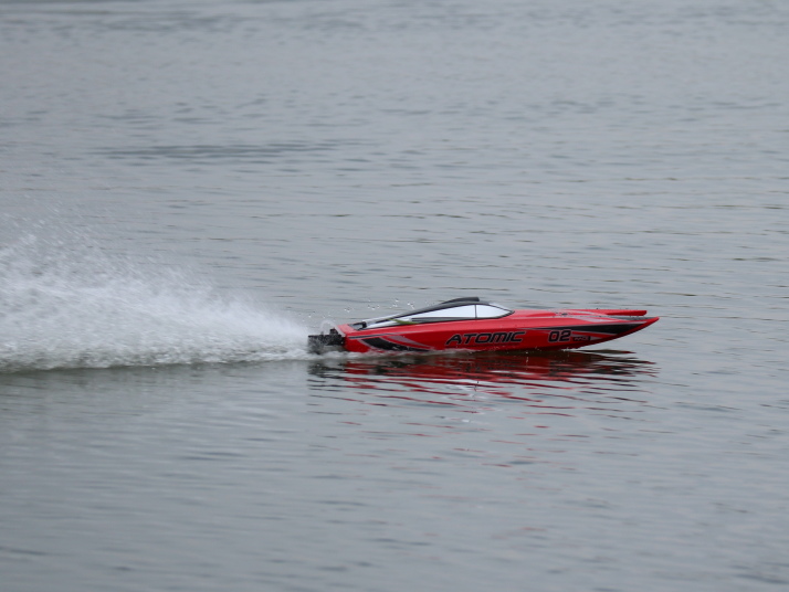 | 完璧! モータ交換後に走らせてみた。低回転でモータが滑らかに回るのは嬉しい。付属のモータはどこか不具合があったのかも。モータ交換時にユニバーサルジョイントが一直線になるようにモータの高さを微調整。そのお陰か前よりも静か。 最高速度はむしろ今回のモータの方が優れている気がする。全体的に性能アップ。 10分走らせてモータを触ると丁度お風呂の温度、45度前後と思われる。もちろん異臭なし。リポ電池は2セル2700mAh、残量は45%。15分は余裕で走るはず。 万一に備えて船首の空間に発泡スチロールを配置。これで実質的に完成。 全備重量は1.4kgと説明書の2kgに比べると随分軽量。もちろん重心指定位置。そのお陰か加速性が良い。近くの川で遊ぶのに文句のない船体となった。(2020年2月29日) |