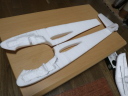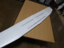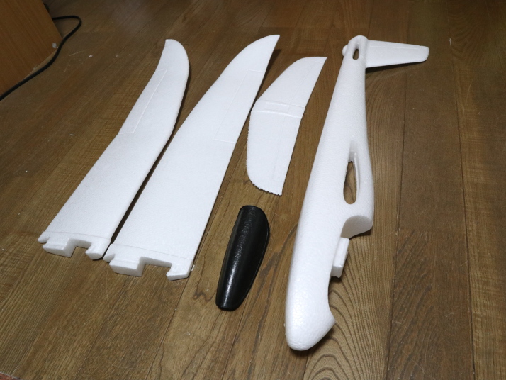| スケール機っぽい ネットで見つけたフリーフライトのEPPグライダ、値段はポイント利用で1200円也、翼幅1m。海外からの発送、梱包が雑で、翼端が折れており、胴体は尾翼部で湾曲していたが直せる範囲。 まずは素のままで投げてみた。意外と素直に飛ぶことを確認、重心位置は前縁から47mmでOK。ラジコン化して上手くいきそうなので製作開始。 小さなグライダは経験的にラダー、エレベータの2chとすると旋回時に速度が落ちない。本機の場合、翼端で上反角が設定されているのでラダー旋回できると判断。 この手の機体の製作動画は海外で結構見つかるが、多くはサーボを胴体の外側から差し込みリンケージが露出している。デザイン的に面白くないのでサーボ、リンケージを内装式とする。 そのために熱線カッターで胴体を左右に分割した。これは湾曲した後部を真っすぐにする狙いもある。 |