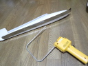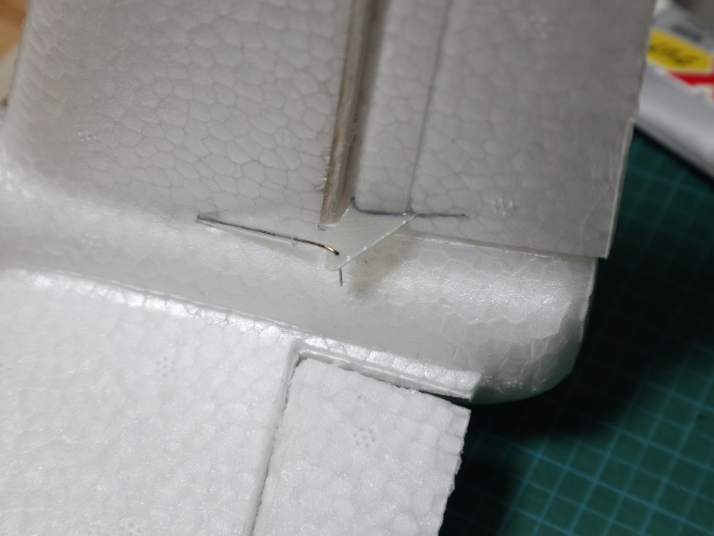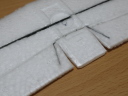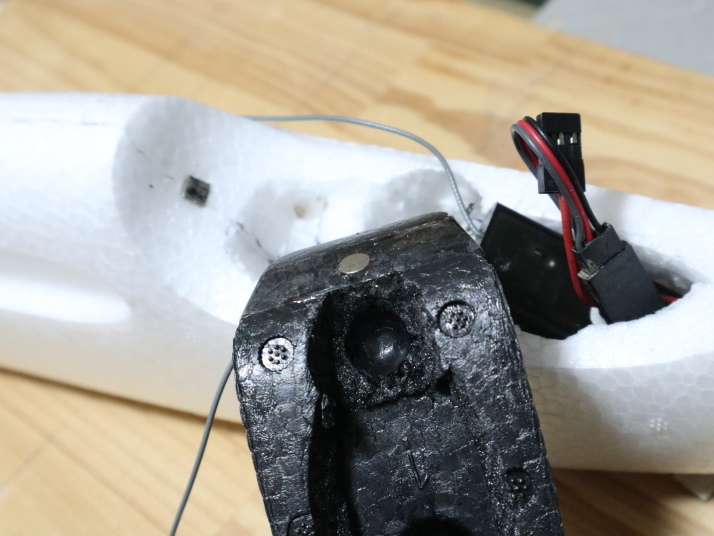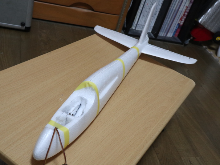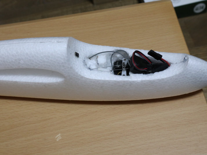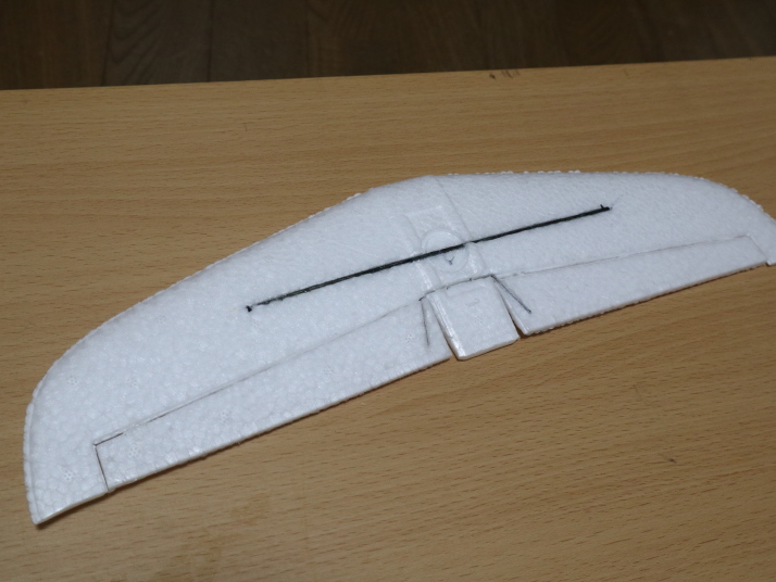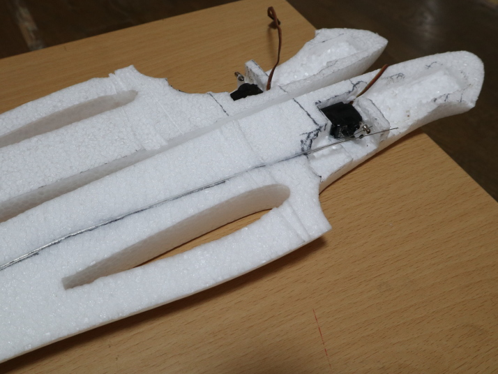 | リンケージは、内径0.8mmのPTFEチューブと0.6mmのステンレス線を使用。サーボを位置決めして動翼からサーボまでPTFEチューブを埋め込んだ。 ここで問題発生。手元にある0.6mmのステンレス線は巻いた状態のもの。このままでは抵抗が大きくサーボへの負担が大きい。これを真っすぐにするのは意外と難しい。ネット上の情報を試してみたが上手くいかなかった。 仕方ないのでギターの弦で0.4mmのものを使用してみた。もちろん軽く動く。本機は小型なので0.4mmのピアノ線で座屈することなく上手くいった。 EPPの胴体を切り込んでバッテリの場所も確保、前側に配置することができた。そして、左右の胴体をGPクリアで接着して真っすぐな胴体になった。受信機はバッテリとサーボとの間のスペースに配置。 |