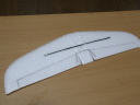 | 動翼 水平尾翼は下面にカーボンロッドを埋め込んで補強。動翼はもともとのラインに沿って切り出し。左右の動翼は0.8mmのステンレス線で連結。 垂直尾翼の動翼は、少し大きくカット。尾翼自体には2mmバルサを接着して補強。動翼のヒンジはクリアホルダから切り出し。ボンドのGPクリアで接着。 メカは手元にある小型サーボ(JRのDS318)、受信機、そしてウェイト代わりに200mAhのニッケル水素電池を使用。本機のキャノピーには32gの球が埋め込まれていた。メカと同じような重さ。 |