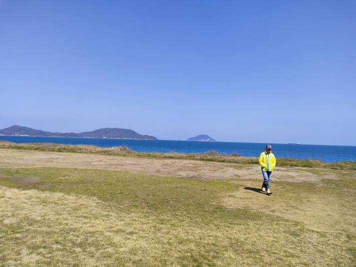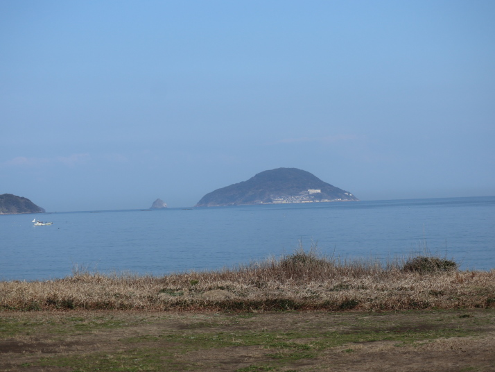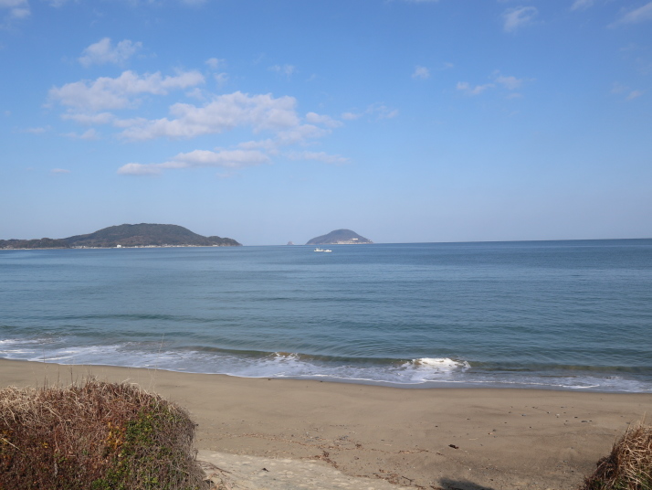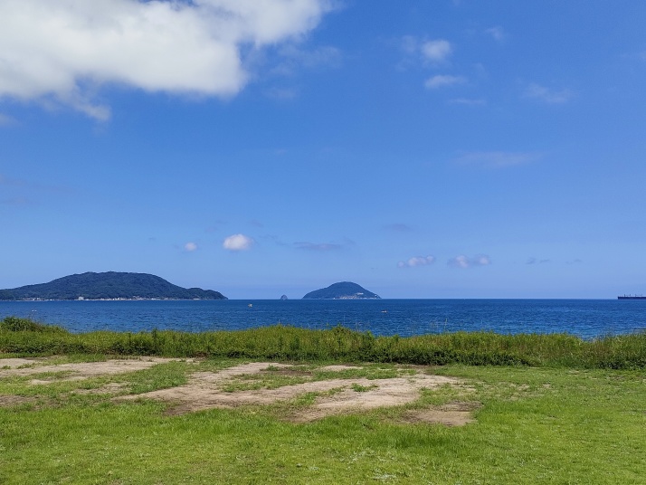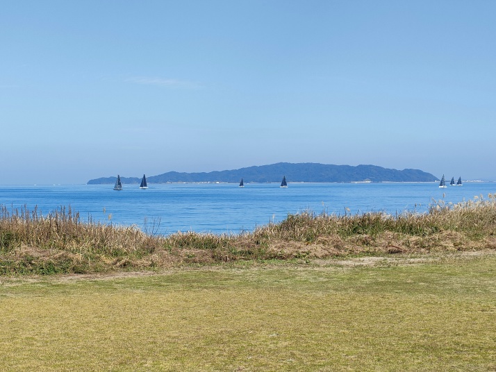 海上ではヨットが帆走、風が弱くスピードは出ていない様子。